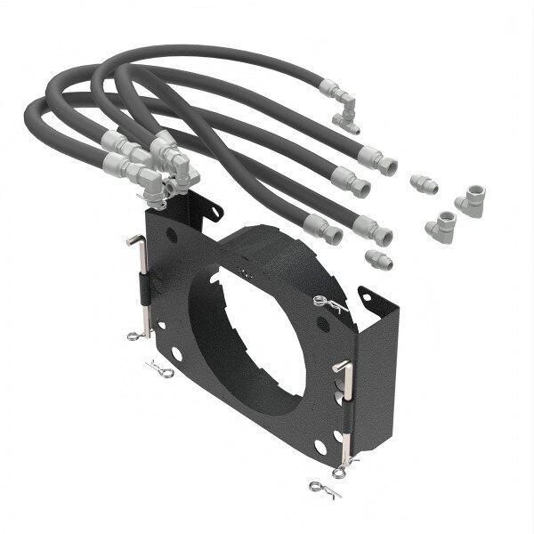 Fan mount bracket kit. This kit includes the bracket to mount to the fan housing, as well as the hoses and fittings required to install the blockage prevention system to the fan hydraulics system. This bracket kit is designed to fit Great Plains and Salford Fans with 18" Bolt Circle on Fan Screen.